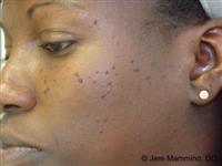 January 4, 2011 Dermatosis papulosa nigra is a condition in which small dark bumps develop on the face. These first appear during teen years, slowly becoming more pronounced as one ages. This is fairly common in blacks, present in about one third of adults. Occasionally this may also appear on white and oriental skin. The individual lesions are black or dark brown flat papules, ranging from 1 – 5mm in diameter. They are most numerous on the upper cheeks, but can occur on the rest of the face, neck, chest, and back. These are probably a variant of seborrheic keratoses since under a microscope they are indistinguishable. Cosmetic removal of these lesions should be done with care since the darker the skin type, the higher the chance of pigmented scars. One planning removal may consider having several test lesions on the side of the face treated to assess their risk of scarring. Removal with light electrodesiccation, cryosurgery, or curettage are all effective means of treatment. http://www.adv-derm.com